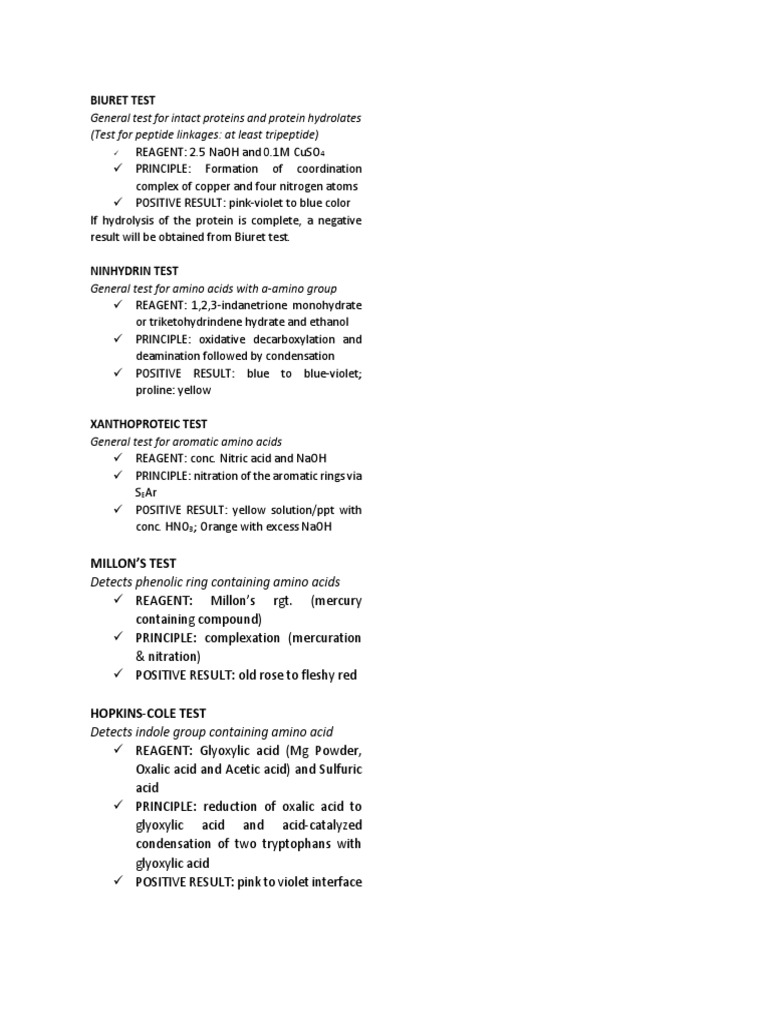 This test used for detecting the presence of tryptophan in proteins. The condensation between two main rings of tryptophan by glyoxylic. When tryptophan is present in a solution, it gives a reddish violet ring. Tryptophan is an amino acid. The indole ring reacts with glyoxylic acid in the presence of a strong acid to form a violet cyclic product. Concentrated sulfuric acid is slowly added to form two layers. Purple color at the interface. Intact casein and base hydrolyzate are positive; The indole group of tryptophan reacts with. This test is specific test for detecting tryptophan. The indole moiety of tryptophan reacts with glyoxilic acid in the presence of concentrated sulphuric acid to give a purple colored product. The test is also termed as 'glyoxylic acid test' as the reagent contains glyoxylic acid. ( tryptophan and egg albumin).